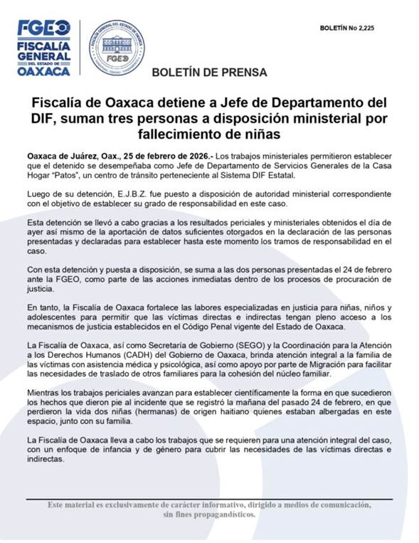AN / OAXACA.-Las autoridades de justicia de Oaxaca iniciaron una investigación penal y detuvieron a tres personas por la muerte de dos niñas de origen haitiano, tras caer en una fosa séptica de la Casa Hogar “Patos”, del centro de tránsito perteneciente al Sistema DIF Estatal.
