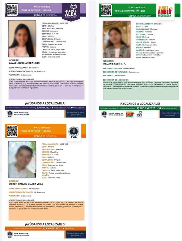 La fiscalía informó que el pasado sábado 17 de enero de 2026, se inició una carpeta de investigación con motivo del reporte de la desaparición de las tres personas; sin embargo, la ficha de búsqueda difundida por la misma fiscalía apunta que la desaparición se registró desde el 15 de enero.