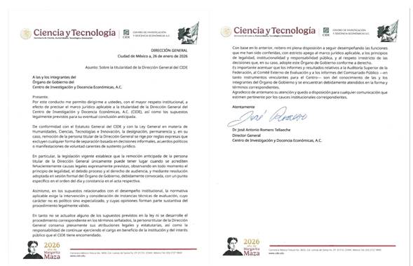 Este mismo lunes, los integrantes del órgano de gobierno del CIDE recibieron un oficio firmado por Romero Tellaeche en el que indicó que conservará el puesto hasta que no se presente el proceso de remoción anticipada.