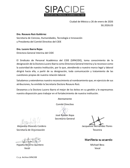 Por su parte, el Sindicato de Personal Académico del CIDE tomó conocimiento del nombramiento de la directora interina y la reconoció como la nueva autoridad. En un oficio, los agremiados validaron la designación y le desearon éxito en su gestión.