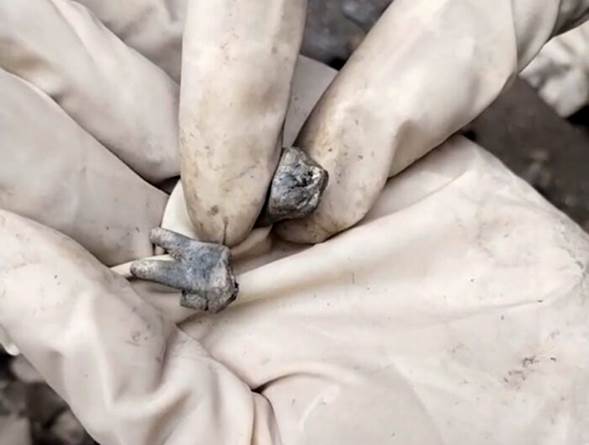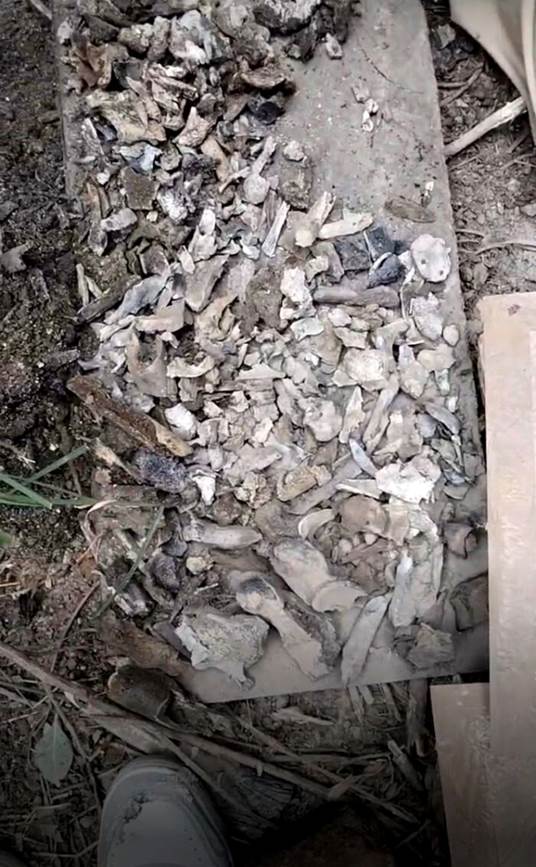 Allí, observaron “cal esparcida, una estructura tipo parrilla, tierra removida y restos óseos”, entre los que identificaron posibles “molares, pedazos de cráneo, costillas y rótulas”, según narran en las transmisiones.