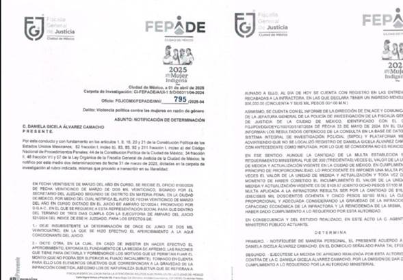 De acuerdo con la notificación, la autoridad ministerial considera acreditado que Álvarez Camacho fue legalmente requerida y notificada el 14 de mayo de 2024 para eliminar en un plazo de seis horas dos mensajes que permanecieron visibles al menos hasta el 17 de mayo, lo que se tuvo como desacato al requerimiento.