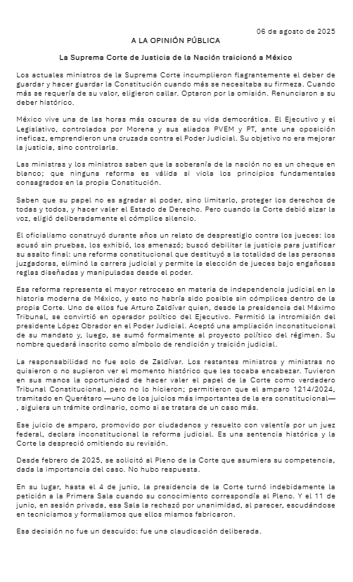 El texto es severo en su juicio, declarando que el nombre de Zaldívar “quedará inscrito como símbolo de rendición y traición judicial”.