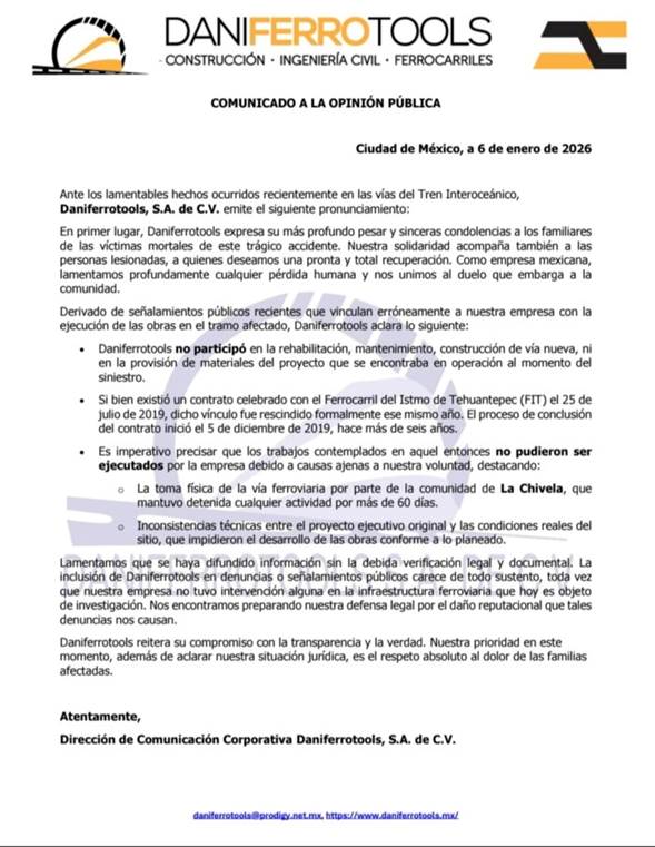 La empresa explicó que sí firmó un contrato con el Ferrocarril del Istmo de Tehuantepec en 2019, pero que fue rescindido ese mismo año por inconsistencias técnicas y por la ocupación de la vía férrea en La Chivela, lo que impidió el inicio de las obras. Según su versión, los trabajos nunca se ejecutaron.