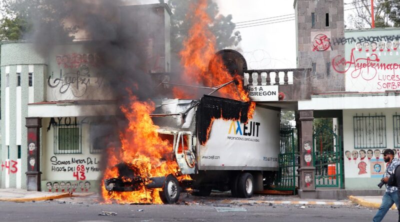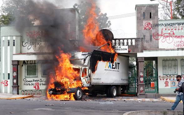 Como parte de las movilizaciones de cara al aniversario 11 de la desaparición de los 43 normalistas de la Escuela Normal Rural Raúl Isidro Burgos, una decena de activistas realizaron pintas, lanzaron explosivos y dirigieron un camión de carga a la puerta del recinto que lograron derribar.
