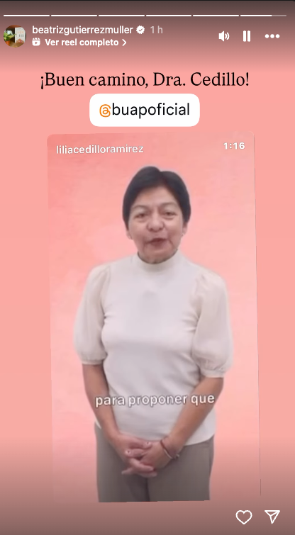 Gutiérrez Müller no se pronunció sobre su postulación al cargo universitario, pero sí emitió un mensaje de apoyo a la actual rectora, Lilia Cedillo.