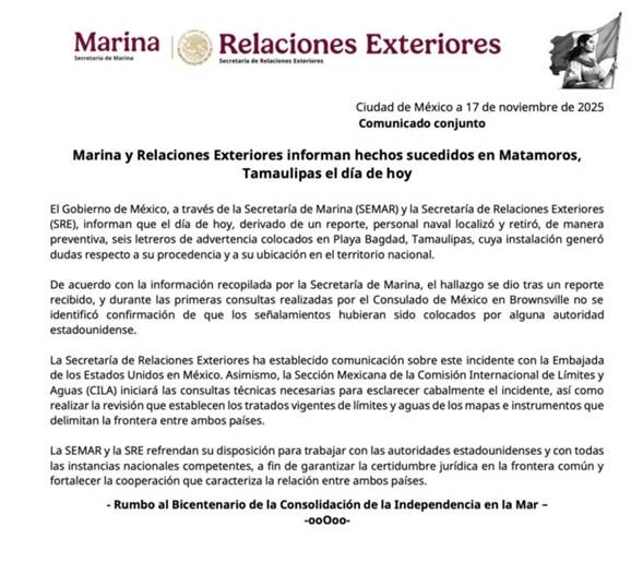 La dependencia explicó que, tras las primeras verificaciones, “no se identificó confirmación de que los señalamientos hubieran sido colocados por alguna autoridad estadounidense”, de acuerdo con consultas realizadas por el Consulado de México en Brownsville.