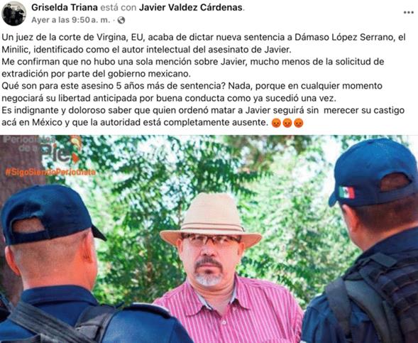 A través de una publicación en redes sociales, Triana señaló que durante la imposición de la sentencia no se mencionó el asesinato de Javier Valdez, ni tampoco se abordó la solicitud de extradición por parte del gobierno mexicano.
