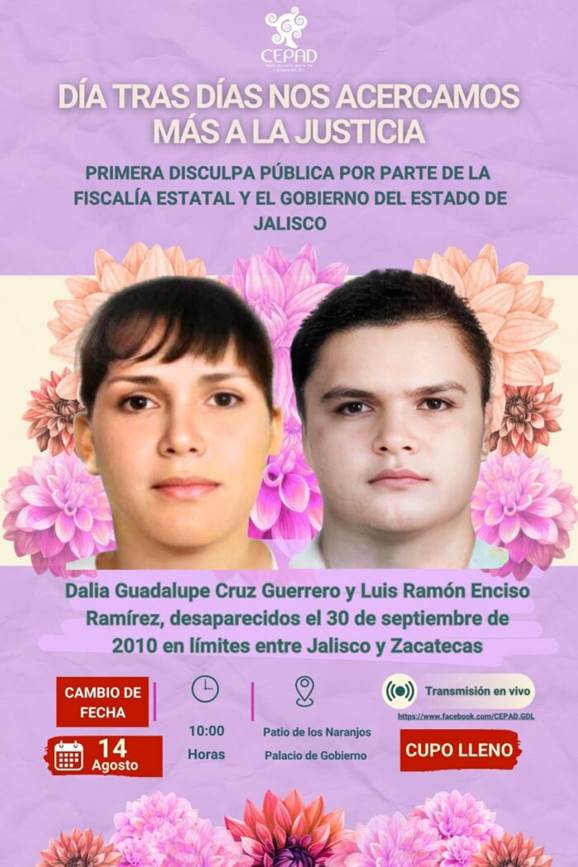 AN / JALISCO.-El Centro de Justicia para la Paz y el Desarrollo (CEPAD) informó que la Fiscalía del Estado de Jalisco ofrecerá por primera vez una disculpa pública por la desaparición de dos personas, aunque la fecha fue reprogramada.