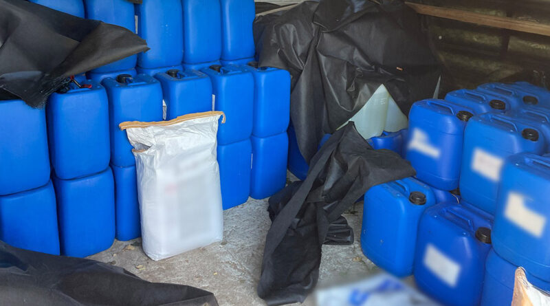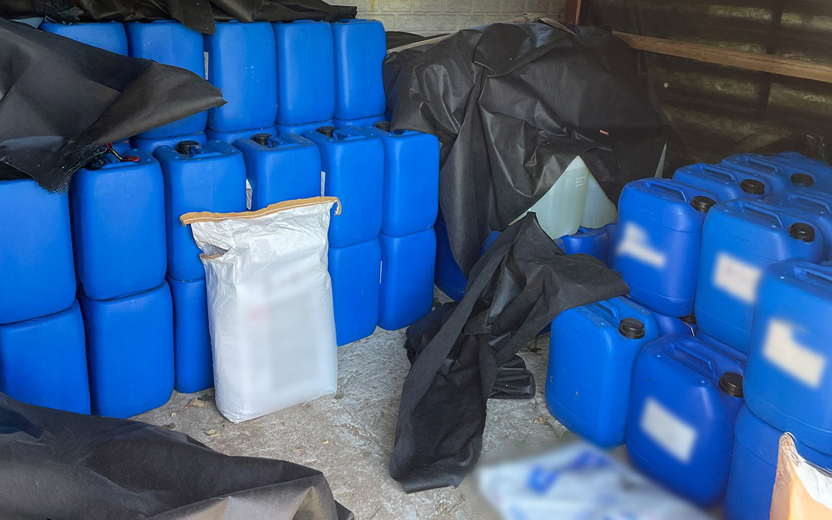 En la propiedad allanada, ubicada en instalaciones agrícolas, los agentes hallaron dispositivos para la producción de drogas a gran escala. El comunicado oficial detalla que fueron asegurados “más de 300 litros de metanfetamina y BMK, así como casi 3 toneladas de productos químicos utilizados en el proceso de producción de metanfetamina”.