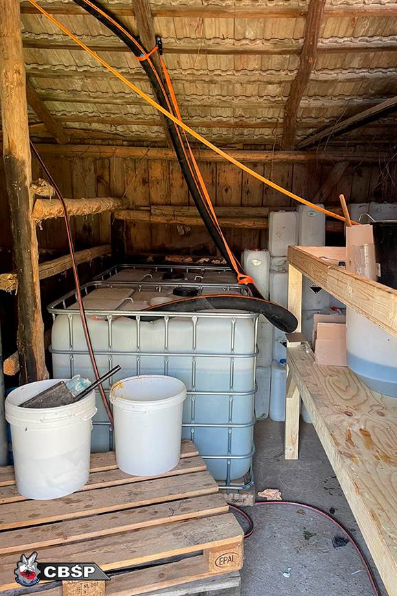 Se ve un lugar equipado con grandes tanques y barriles, así como productos químicos, presumiblemente utilizados en la producción de drogas sintéticas. El video también muestra la detención de una persona, a quienes los agentes encañonan y hacen descender de una camioneta blanca.