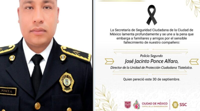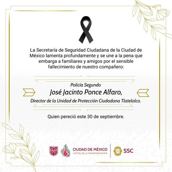 AN / CDMX.-La Secretaría de Seguridad Ciudadana (SSC) de la Ciudad de México confirmó la muerte de José Jacinto Ponce Alfaro, jefe del Sector Tlatelolco, quien perdió la vida durante un intento de asalto en el municipio de Chalco, Estado de México.