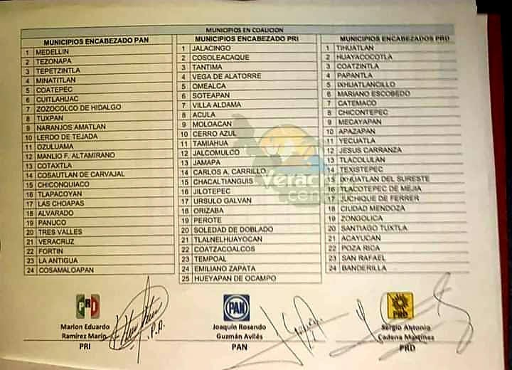 *** ¡Habemus Alianza! FINALMENTE se concretó ya la alianza PRI-PRD-PAN, denominada “Va por Veracruz”, que abarcará 73 municipios y las 30 diputaciones locales… Este jueves los dirigentes del PRI, Marlon Ramírez; del PRD, Sergio Cadena y Joaquín Rosendo Guzmán del PAN llegaron a los acuerdos correspondientes y firmaron el documento de la alianza, que será llevado al Organismo Público Electoral local… La comisión designada para llevar a registrar dicha alianza ante el órgano electoral correspondiente está integrada por Fernando Kuri Kuri, Joel Arcos por el PRI; Roberto Peña González, Guadalupe Salmones Gabriel por el PRD y Tito Delfín Cano y Rubén Hernández Mendiola por el PAN…