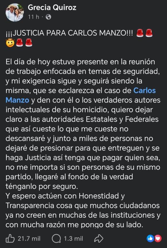 Tras la reunión, Quiroz publicó un mensaje en redes sociales en el que reiteró su demanda de justicia y sostuvo que su exigencia “sigue y seguirá siendo la misma”, al pedir que se esclarezca el homicidio del alcalde.