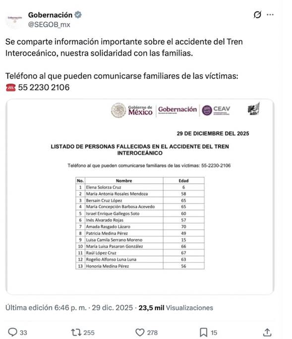 Las personas fallecidas por el descarrilamiento del Tren Interoceánico fueron identificadas por la Secretaría de Gobernación a través de una lista publicada en sus redes sociales en la que detallaban los apellidos y edades.
