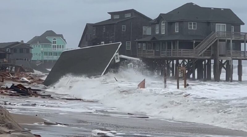 Cinco viviendas desocupadas, sostenidas por pilotes, se tambalearon y colapsaron por las olas antes de hundirse en el mar en la tarde del martes en el pueblo de Buxton, que hace parte de la cadena de islas Outer Banks a lo largo de la costa.
