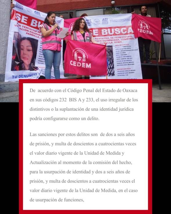 De acuerdo con el Código Penal del Estado de Oaxaca en sus códigos 232 BIS A y 233, el uso irregular de los distintivos o la suplantación de una identidad jurídica podría configurarse como un delito.