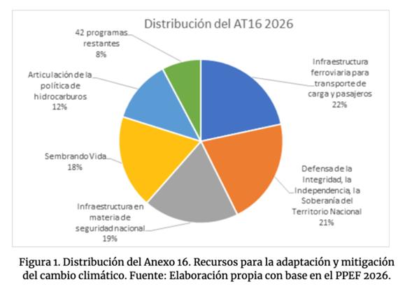 De acuerdo con el análisis, el AT16 contará con 212 mil 569 millones de pesos, lo que significa una reducción de 1.24% en términos reales respecto a lo aprobado en 2025. Aunque se trata del componente fundamental para la acción climática, gran parte de los recursos se concentran en programas cuya relación con la mitigación o adaptación al cambio climático no es clara ni medible.