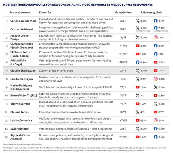 “En la parte superior de la lista, Carmen Aristegui y Carlos Loret de Mola son ambos periodistas veteranos con presencia continua en los medios tradicionales que también han lanzado exitosas empresas de noticias digitales”, señala.