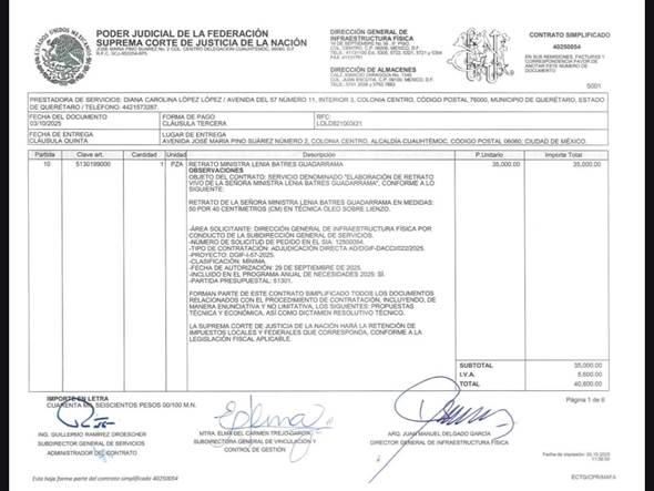 El pleno escándalo, se difundió un contrato de la Corte para realizar un “retrato vivo de la señora ministra Lenia Batres”, asignado a la artista Diana Carolina López López, con un valor de 40 mil pesos.