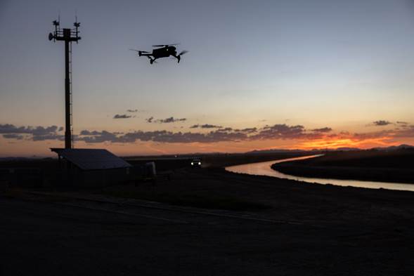 Un dron DJI Mavic 3 sobrevuela una torre de vigilancia fronteriza de EU en Yuma, Arizona, el 27 de septiembre de 2022. Gettyimages.ru