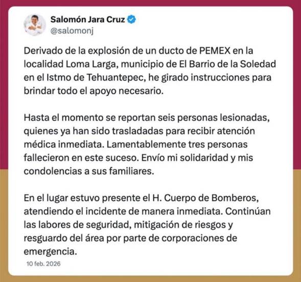 AN / OAXACA.-Tres personas fallecieron y seis más resultaron heridas tras una explosión e incendio de un ducto de Petróleos Mexicanos (Pemex), ubicado en Loma Larga, municipio de El Barrio de la Soledad, confirmó el gobernador del Estado de Oaxaca, Salomón Jara Cruz.