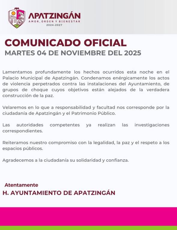 La administración reiteró su postura institucional frente a los hechos, sobre lo que resaltó su “compromiso con la legalidad, la paz y el respeto a los espacios públicos”, y agradeció a la población por su respaldo, “solidaridad y confianza”.