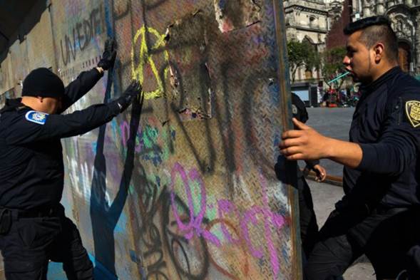 - Ciudad amurallada. Las gigantes vallas metálicas soldadas entre sí rodean Palacio Nacional y la Catedral Metropolitana. Jóvenes de Somos México “remodelaron” el muro de la ignominia que mandó poner la presidenta Claudia Sheinbaum en el Zócalo, dijo Guadalupe Acosta Naranjo en su cuenta de X.
