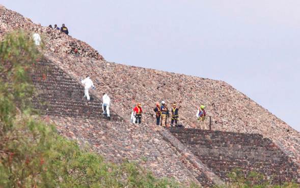 Personal de investigación realizó diligencias en los distintos niveles de la Pirámide de la Luna, donde fueron localizados indicios balísticos y otros objetos que ya forman parte de la carpeta de investigación.