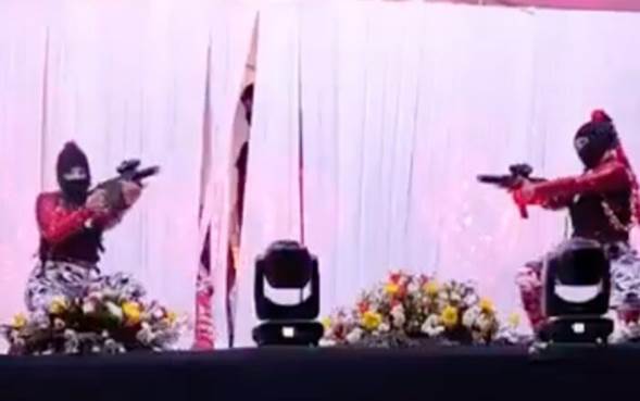 En el video se observa a un grupo de alumnas y alumnos vestidos con pantalón camuflado, playera roja, un chaleco antibalas, embozados y con réplicas de armas largas con las que apuntan al público presente.