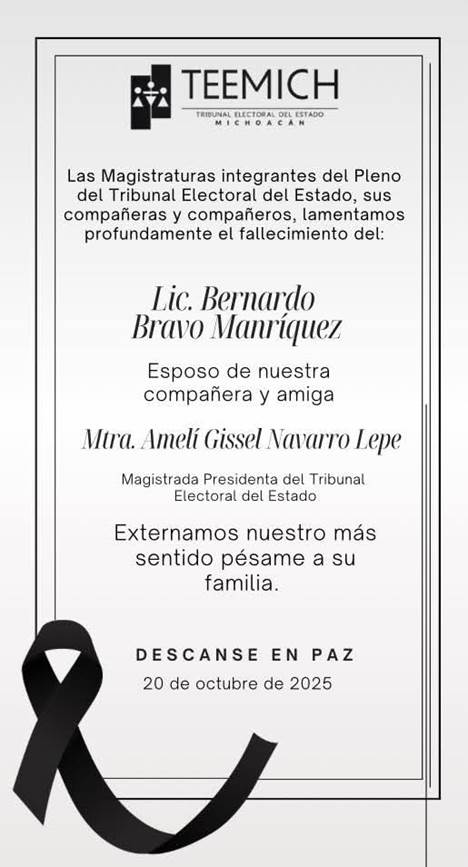 El TEEMICH y otros organismos electorales del país emitieron sus condolencias, deseándole fortaleza ante la pérdida irreparable.