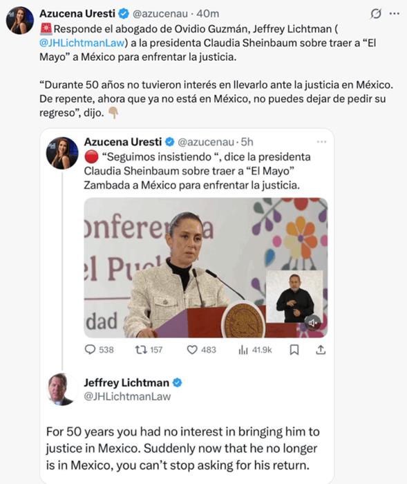 • El 25 de julio de 2024, Ismael ‘El Mayo’ Zambada fue detenido en Texas. Mañana se cumple un año de haber sido capturado misteriosamente en la frontera de EU con México. “Durante 50 años no le interesó llevarlo ante la justicia en México. De repente, ahora que ya no está en México, no puede dejar de pedir su regreso”, dijo Lichtman en relación a las declaraciones de la mandataria Sheinbaum Pardo en la conferencia matutina.