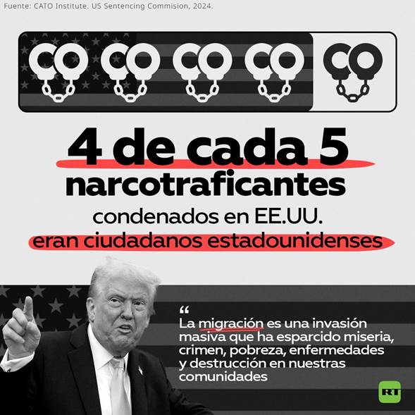 - Pese al discurso de Trump para criminalizar a los migrantes por el problema de las drogas, las cifras socavan esa acusación. Los ciudadanos estadounidenses representan el 78 % de todas las condenas a nivel nacional en 2024 relacionadas con el tráfico de drogas, según los datos analizados por el Instituto Cato.