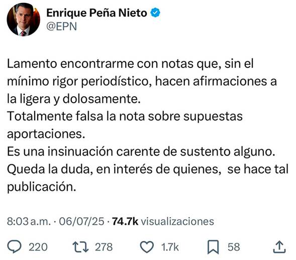 “Totalmente falsa la nota sobre supuestas aportaciones. Es una insinuación carente de sustento alguno. Queda la duda, en interés de quienes, se hace tal publicación”, concluyó.