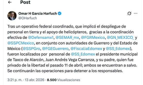 AN / MÉXICO.-El gobierno federal anunció que tras un operativo federal conjunto, se logró el rescate del alcalde de Taxco de Alarcón, Juan Andrés Vega Carranza, y su padre, mismos que habían sido secuestrados el pasado 11 de abril en estado de Guerrero.