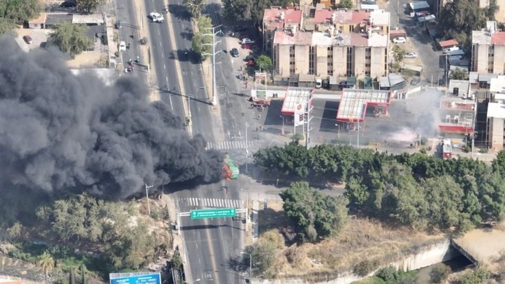 Vista de un dron que muestra humo saliendo de vehículos en llamas durante los bloqueos establecidos por el crimen organizado este domingo 22 de febrero en Guadalajara, Jalisco. Foto: Reuters
