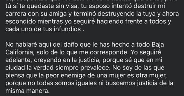 «Intentaste quitarme mi casa y pagaste con la tuya, tus procesos infundados han retrasado mi residencia al lado de mi esposo; aclaro que retrasar no es lo mismo que evitar, pero tú sí te quedaste sin visa, tu esposo intentó destruir mi carrera con su amiga y terminó destruyendo la tuya y ahora escondido, mientras yo seguiré haciendo frente a todos y cada uno de tus infundios», escribió.