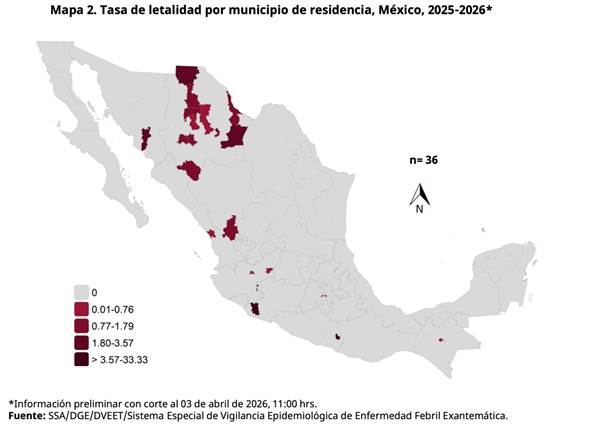 El recuento oficial de decesos por sarampión marca que Chihuahua se mantuvo a la cabeza con 21 casos, seguido por Jalisco con 5, Durango 2 y Ciudad de México 2; mientras que Sonora, Michoacán, Tlaxcala, Chiapas, Guerrero y Sinaloa contabilizaron una muerte por cada entidad.