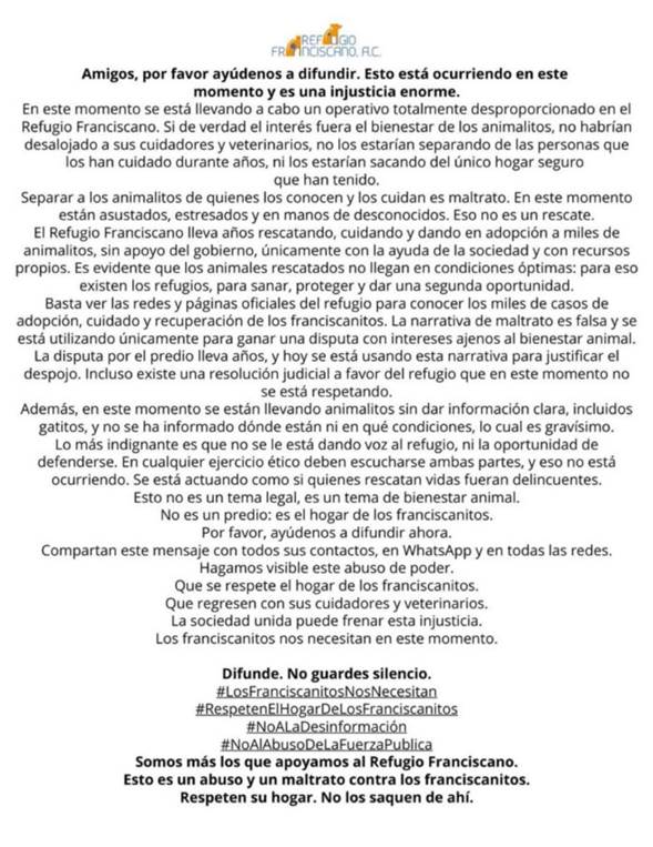 Tras el operativo del 7 de enero, Refugio Franciscano emitió un comunicado denunciando que la acción policial fue totalmente desproporcionada. La organización calificó el acto como una injusticia impulsada por intereses inmobiliarios ocultos tras una narrativa de supuesto maltrato animal.