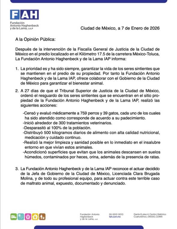 Tras la denuncia del Refugio Franciscano por un desalojo violento, la Fundación Antonio Haghenbeck y de la Lama IAP emitió un comunicado propio detallando las acciones tras la intervención de la Fiscalía capitalina en el predio.