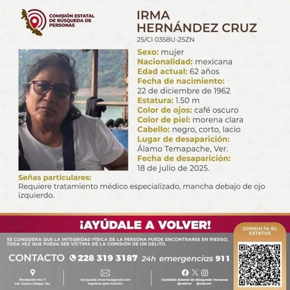 El jueves, la Fiscalía General del Estado (FGE) informó sobre el hallazgo del cuerpo sin vida de Irma Hernández Cruz en el municipio de Álamo Temapache, ubicado en el norte del estado de Veracruz, en la región del golfo de México.